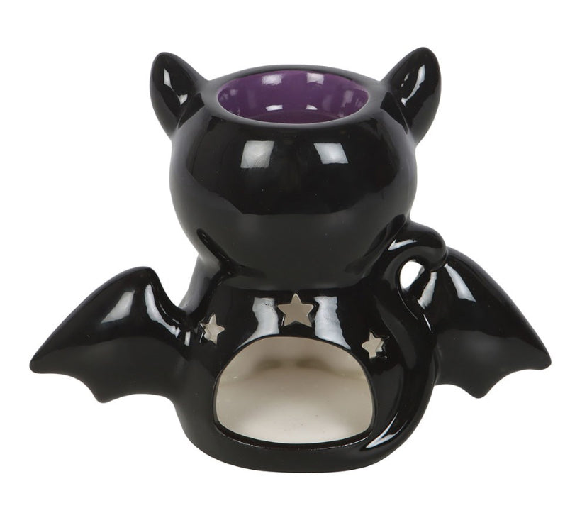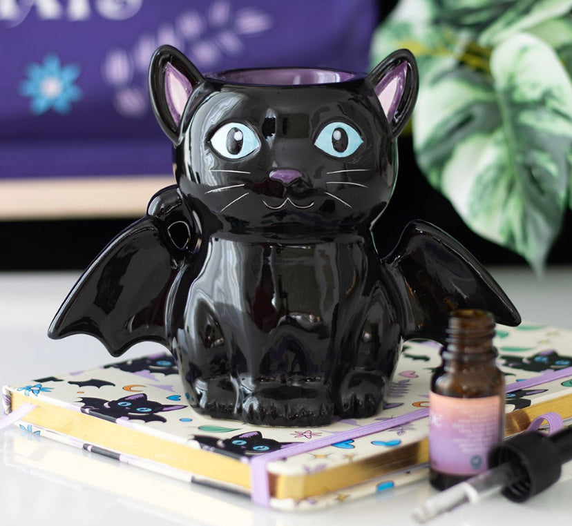 This bat-winged black cat burner is perfect for filling the home with enchanting scents. Simply place a tealight in the back and add sizzlers to the top bowl. Ideal for gothic decor and mystical relaxation. Never leave a lit burner unattended and allow to cool fully before handling.