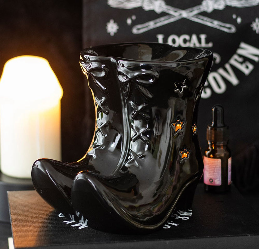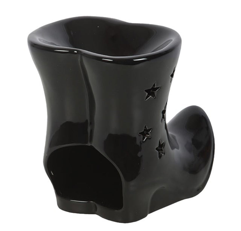 Add a bewitching touch to your space with this black ceramic burner shaped like a pair of classic witch boots, complete with star cut-outs that glow when in use. Simply place a single standard tealight in the space at the back and add a sprinkle of sizzlers in the bowl to fill the room with your favourite scent. A fun and functional piece for spellcasters, gothic decor fans, or anyone who loves a dash of magic.